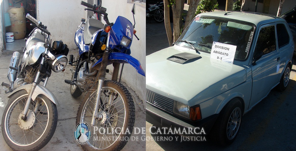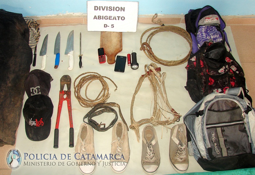 Finalmente, tras una persecución, los cuatro sujetos fueron ubicados e interceptados en la cuestecilla del Payahuaico mientras llevaban los animales, y el personal interviniente secuestró un automóvil Fiat 147, (XBU-596), de color gris, una motocicleta Motomel Skua 150 cc., (679-JUT), de color azul y una Yamaha YBR 125 cc., (287-CIP), de color gris, tres cuchillas tipo carnicero, un cuchillo tipo tramontina, una chaira, una pinza alicate de gran tamaño, dos torzales, un bozal, dos linternas, dos teléfonos celulares, tres mochilas, tres gorras, dos (2) pares de zapatillas y una tabla de picar carne de madera.