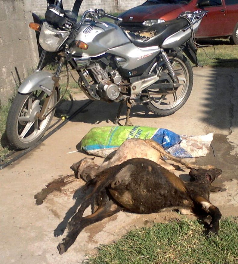 de color gris, trasportando dos animales caprinos muertos sin faenar que habría