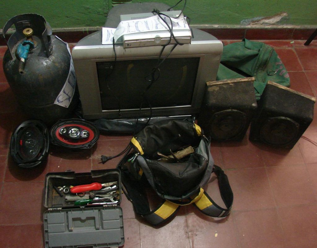 En tanto que, a las 11:00 de hoy, efectivos de la misma Seccional, en un sitio baldío existente en la intersección de la calle Gral. Roca y Pasaje Francisco Latzina, procedieron al secuestro de un (1) Televisor 21” marca Sanyo, un (1) Equipo decodificador de Directv, una (1) caja con herramientas varias, dos (2) parlantes para auto marca Targa y una (1) garrafa de 10Kg., que también estaban ocultos.