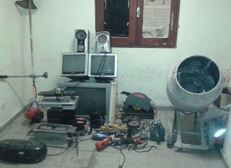 En el lugar encontraron oculto entre la maleza 2 televisores de 29'; 1 LCD de 32”; 1 computadora completa; 1 monitor de computadora; 1 mouse; 1 teclado; 2 reproductores de DVD; 1 motoguadaña; 2 amoladoras; 1 carburador de una motocicleta 250 cc. y 1 motosierra.