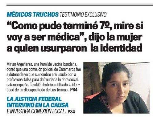 "Como pude terminé 7º, mire si voy a ser médica", dijo la mujer a quien usurparon la identidad, publico hoy en su tapa el diario El Liberal de Santiago del Estero, y relata que "Mirian Argañaraz, una humilde vecina bandeña, contó que una comisión policial de Catamarca fue a detenerla ya que su nombre era usado por la profesional falsa para defraudar a la obra social catamarqueña (OSEP). También habrían utilizado la identidad de un discapacitado de Las Termas”.