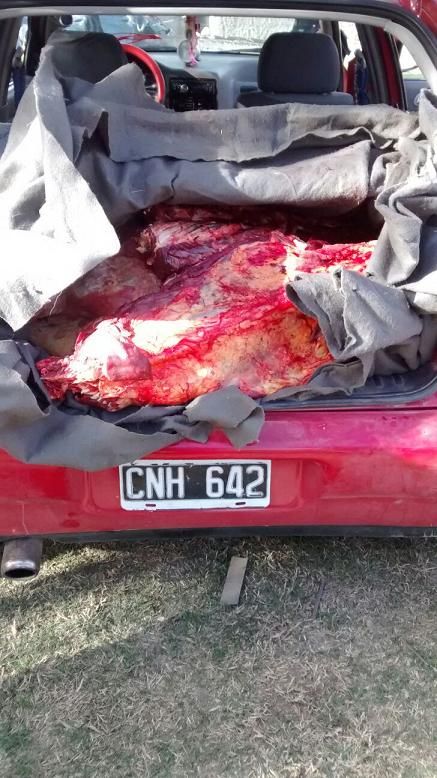 Tras proceder a la requisa del rodado, los uniformados encontraron en el interior del baúl un animal vacuno faenado, de aproximadamente130 Kg., del cual no contaban con ninguna documentación que acredite la legítima propiedad y procedencia, como así también carecían de las medidas de higiene y salubridad correspondiente para el traslado del mismo, por lo que se dio inmediata participación a la Fiscalía de la Segunda Circunscripción Judicial, desde donde se dispuso el secuestro de la carne y se indicaron las medidas a adoptar.-