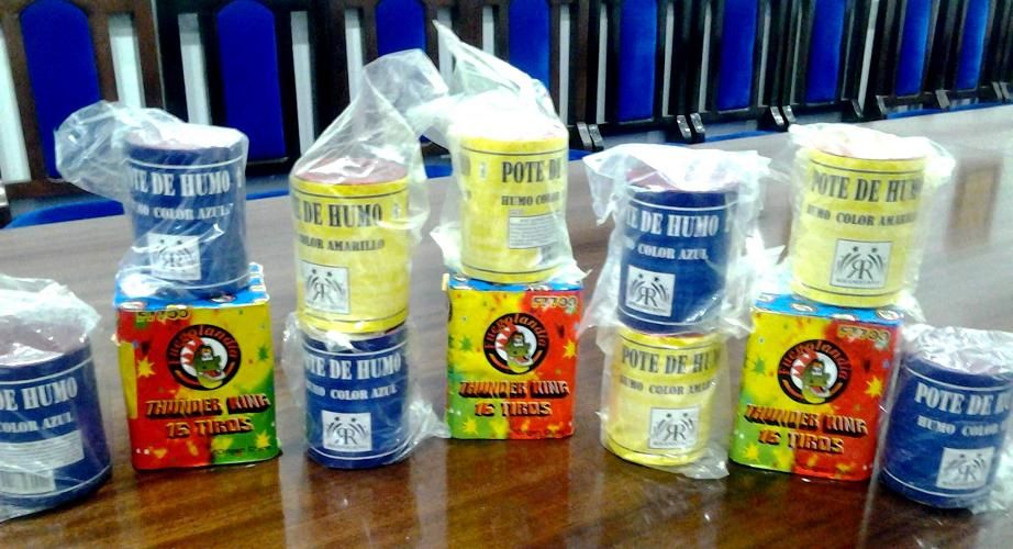 Tras realizar el correspondiente chequeo en los vestuarios de ambos equipos, el personal interviniente observó en el vestuario del Club Atlético Policial, dentro de unos cajones de madera, que contenían calzado deportivo, un bolso de medianas dimensiones de color negro, que tenía 5 potes de humo, de color amarillo, marca Rolando Rivas; 5 pote de humo, de color azul, de la misma marca y 3 tortas de fuegos artificiales de 16 tiros, modelo Thunder King, marca FuegoLandia.