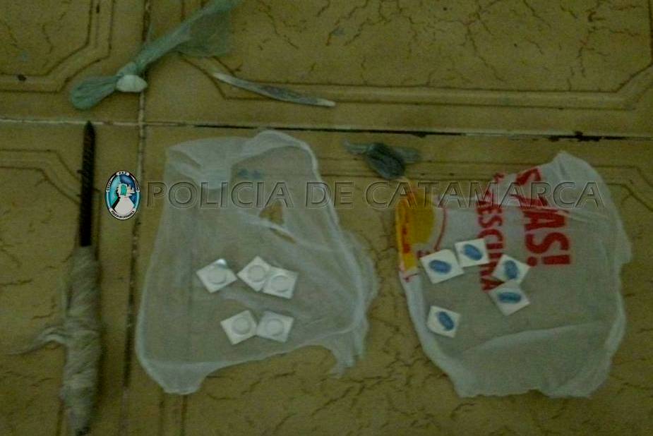 Durante la requisa correspondiente, el personal policial interviniente le encontró entre sus prendas de vestir un elemento punzante, cinco pastillas de Dormicum, cinco pastillas de Rivotril, un envoltorio de nylon con un gramo de Cocaína, otro con la misma cantidad de Marihuana, y un porro.