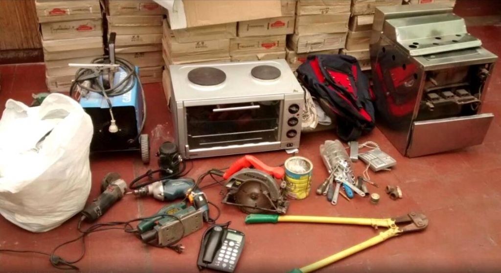En los procedimientos fueron secuestrados los siguientes elementos: un compresor de aire de color azul y una pistola para pintar, una cortadora circular con disco de corte para madera, un taladro eléctrico, una tenaza, un corta perno, un prolongador de 15 metros, una garrafa de agresivos químicos, un compresor de aire eléctrico para 12 volts, cinco cuchillos de diferentes tamaños, una cuchilla, dos teléfonos fijos, una Play Station, un toallón, tres fundas de almohadas, varios juegos de sábanas, dos garrafas de 10 Kg., una amoladora, una freidora, una lijadora orbital, un horno eléctrico, una mochila, prenda de vestir varias, zapatillas, cuatro destornilladores, 21 llaves de boca y estriadas de diferentes numeraciones, una llave de automóvil marca Fiat con llavero de alarma, comprobantes bancarios, tres navajas, bicipartes, tuercas, tornillos y arandelas de varias medidas, una motocicleta Motomel Blitz de color azul, una motosierra, una hidrolavadora, un minicomponente, una soldadora y 180 cajas de mosaicos graníticos.
