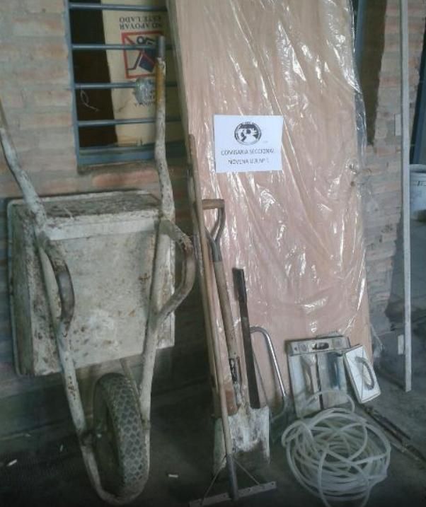 En la vía pública dejaron abandonados una puerta placa, una carretilla, un rastrillo, una sierra, un fratacho, un nivel de mano, una manguera, una llana, un filtro para revoque fino, un machete, una tenaza y dos reglas metálicas que habrían sido sustraídos de una obra en construcción.