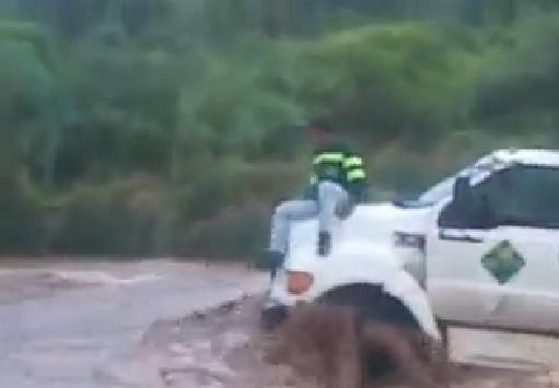 El domingo pasado un camión de Vialidad Provincial de Catamarca quedó atrapado en medio de una crecida cuando intentó cruzar un badén del río Los Puestos en La Puerta, Ambato. El chofer fue rescatado por un colectivo de la empresa Lazo.