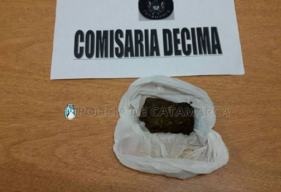 Hoy, a las 17, en el Pasaje Cristo Rey, entre Armando Correa y Florida, efectivos de la Comisaría 10° interceptaron a un hombre de 41 años, oriundo de Banda de Lucero, departamento Tinogasta, a quien le encontraron 1 trozo compactado de marihuana con un peso de 95 gramos.