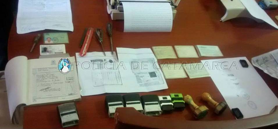 Uno de los procedimientos se concretó en calle Eusebio Ruso S/N° de la localidad de Santa Rosa (Valle Viejo), de donde se secuestraron chapas patentes adulteradas, formularios 08 y 12, cédulas verdes, títulos de propiedad del automotor, sellos de distintas instituciones y profesionales (escribanos y contadores públicos), cubiertas y ruedas armadas, herramientas tipo ganzúa y corta vidrios. También la documentación completa de un Ford Falcón que fue secuestrado días atrás.