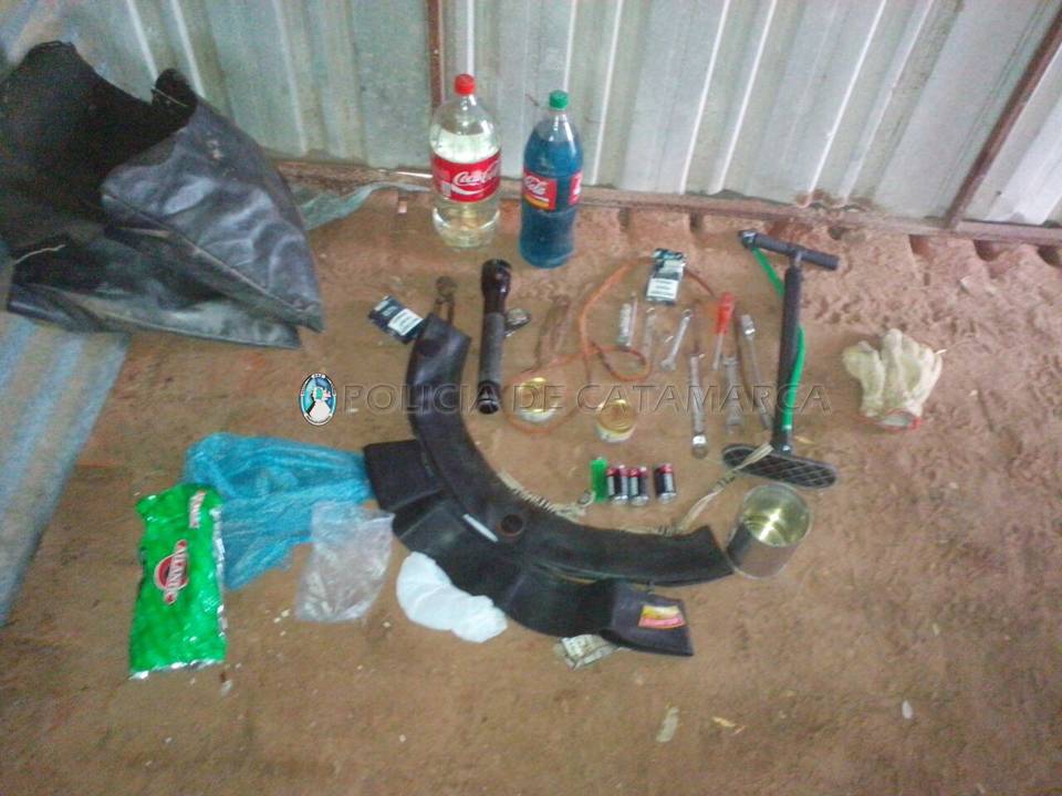 Durante el procedimiento, el personal policial secuestró una pala corta, un machete, una tenaza, una pinza, guantes de cuero, linternas, una sierra, tres cartuchos de escopeta, tres motocicletas; una moto Motomel 125 cc. de color negro, una moto Appia Vectra 110 cc. de color verde y una Honda Titán 125 cc., de color negro en la que circulaban los sujetos.