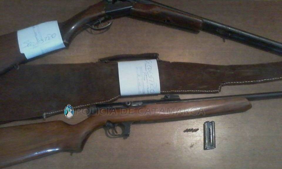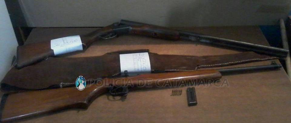 doble caño calibre 20, de color marrón oscuro y una Carabina semi automática