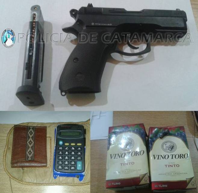 Ayer personal de calle de la Jefatura de Zona "D” con asiento en la Ciudad de Santa María, bajo las directivas del Juzgado de Menores de la Cuarta 4° circunscripción Judicial, se logró secuestrar una imitación tipo aire comprimido, muy parecida a una pistola nueve mm, marca C Z, de color negro. También una billetera de color marrón y una calculadora de color negro.