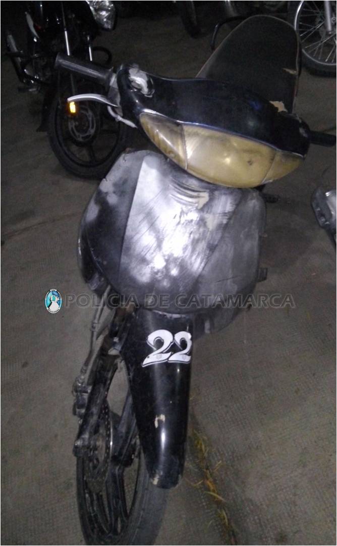 El joven se conducía en una motocicleta Motomel 110cc., sin dominio, de color negro, la cual había sido sustraída en horas de la siesta, de un domicilio del barrio Ongolí, Nueva Coneta Dpto. Capayán, a una mujer de apellido Rodríguez (30).