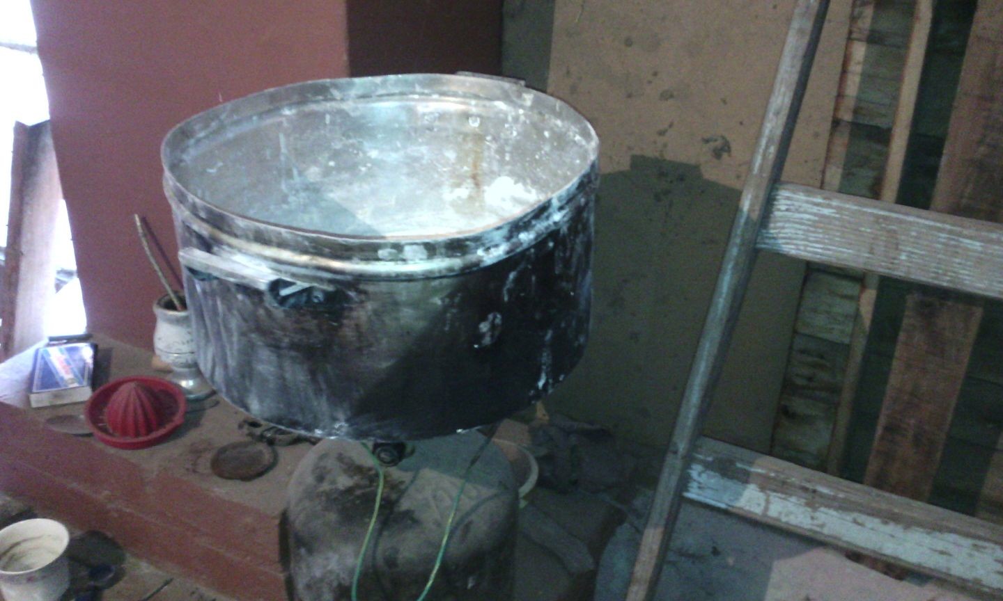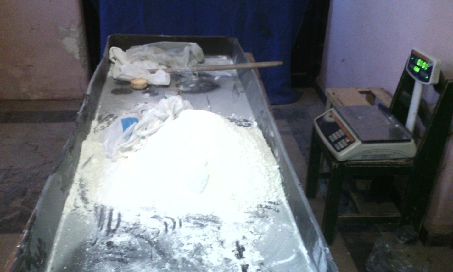 cuchillos, cucharas y tazas con restos de la sustancia estupefaciente, una garrafa