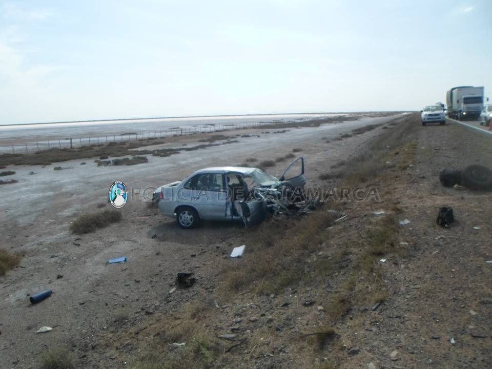 En el lugar, un automóvil Chevrolet Corsa (JOI-086), de color gris, conducido por Alfredo César Décimo (58), acompañado por Ana María De Veliz (60), oriundos de la Provincia de Buenos Aires, por causas que se investigan, chocó frontalmente contra un camión Scania (AXR-160), de color blanco, perteneciente a la empresa de transporte Castaño, al mando de Juan Antonio Juárez (37), domiciliado en la provincia de Córdoba.