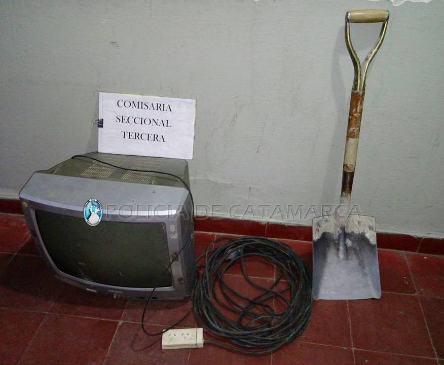 Hoy, a las 5 en calle Padre Sanz y Padre Piñeiro, efectivos de la Comisaría 3° aprehendieron a Nahuel Exequiel Escobal (18), quien llevaba un Televisor de 21”, un cable alargador de 15 metros y una pala ancha cabo de madera.