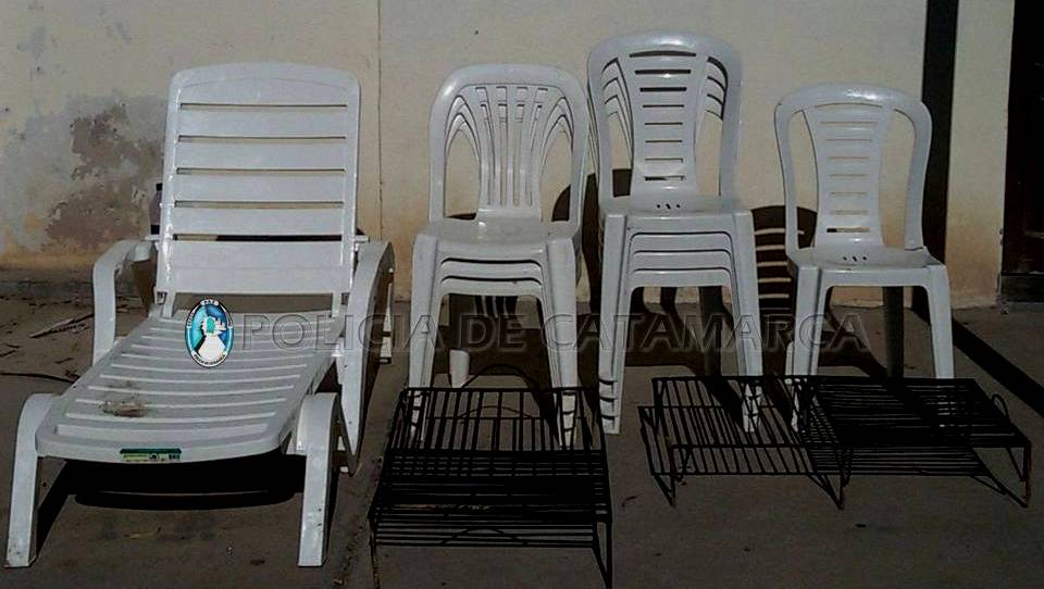 Tras llevar a cabo un rastrillaje en horas de la tarde, en el interior de un descampado del B° Sacramento de esa ciudad, encontraron oculto entre la maleza dos parrillas, diez sillas de plástico Mascardi de color blanco y una reposera de color blanco, que quedaron en calidad de secuestro.