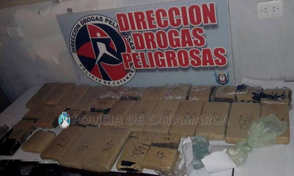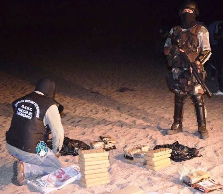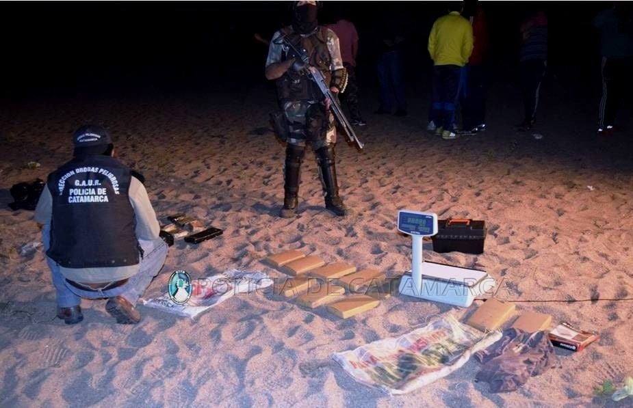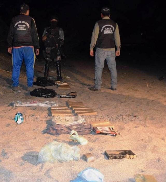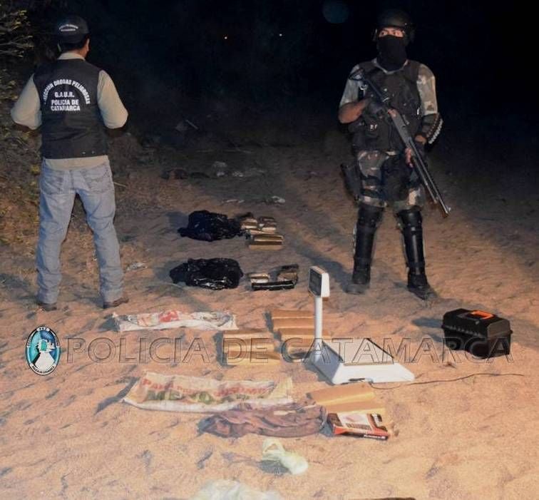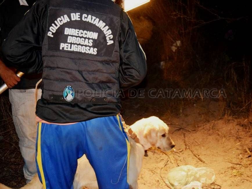 En el lugar, los efectivos incautaron un ladrillo compactado con una sustancia herbácea, tres teléfonos celulares, detuvieron e incomunicaron a un hombre de 40 años de edad, y luego de realizar un amplio rastrillaje en el margen del Rio del Valle, ubicado en inmediaciones al domicilio, con la ayuda de perros adiestrados en la búsqueda de sustancias estupefacientes, encontraron enterrado en la arena gran cantidad de panes compactados con la misma sustancia y pasta base para preparar clorhidrato de cocaína, que luego de ser sometidos a la prueba de campo correspondiente arrojó como resultado que se trataban de 30 Kg. de Marihuana y ½ Kg. de pasta base de cocaína.