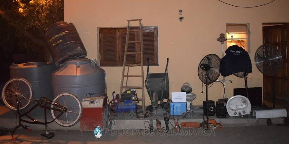 Los procedimientos, se realizaron en dos domicilios de las Localidades de San Isidro y Pozo El Mistol, Valle Viejo, donde a raíz de varias denuncias radicadas en ese Precinto Judicial y luego de realizar una amplia tarea investigativa, se logró el secuestro de 1 equipo de audio marca Sony, un radiograbador Daihatsu, tres ventiladores, una soldadora marca Gama, un TV Led 32” Admiral, una desmalezadora y una motoguadaña marca Still, un compresor Gamma, cuatro amoladoras, tres bombas de agua, un lavatorio de baño con grifería y pié, un bidet, tres tanques plásticos para agua, una carretilla, una escalera tipo tijera, un cargador de baterías marca Shetian, que estarían vinculados a distintos ilícitos contra la propiedad, por lo que fueron puestos a disposición de la Justicia interviniente desde donde se indicaron las medidas a seguir.