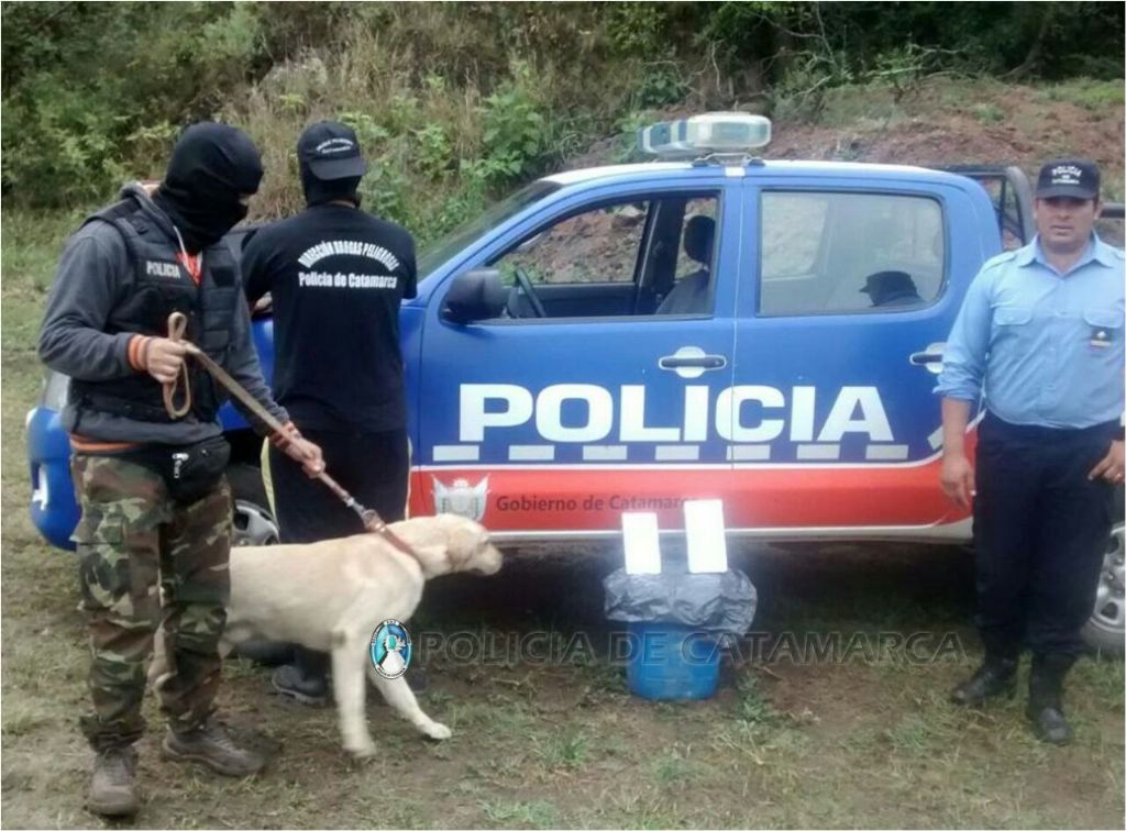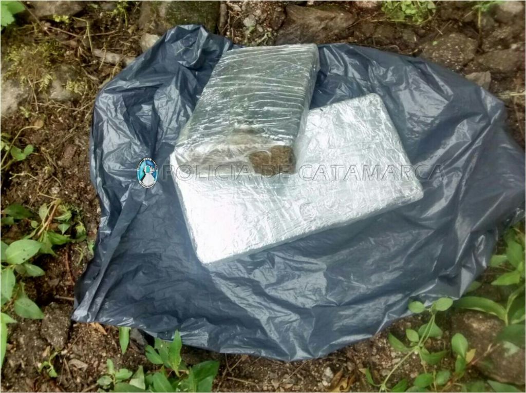 Con luz natural, y bajo las directivas del Juzgado Federal, entre las 8 y las 14 de hoy, el personal de la Dirección Drogas Peligrosas conjuntamente con efectivos de la División de Operaciones Especiales Kuntur y de la Comisaría Departamental La Merced, materializaron un rastrillaje en un área que abarca unos 8 Km, teniendo como referencia el lugar donde el automóvil fue alcanzado tras la persecución y el puesto de control vehicular, y encontraron oculta entre la maleza una bolsa de nylon que contenía en su interior dos panes compactados, que al ser sometidos a la prueba de campo correspondiente arrojó como resultado que se trataban de 2 Kg. de Marihuana que quedaron en calidad de secuestro.