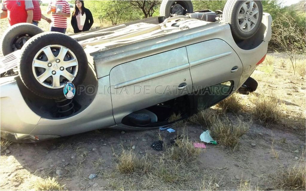 Hoy, a las 16:50, en Ruta Nacional Nº 38, a la altura del ingreso de la localidad de Santa Cruz, Valle Viejo, se registró el vuelco de un automóvil Peugeot 207, dominio PMP 432, de color gris, conducido por Sebastián Ariel Salpachuk (28), acompañado por Karen Johana Noblega (26).