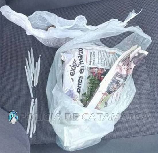 Al realizar una requisa en el interior del rodado el personal policial interviniente encontró una bolsa de nylon y un envoltorio de papel de diario que contenían una sustancia herbácea y 9 cigarrillos de armado casero con la misma sustancia.