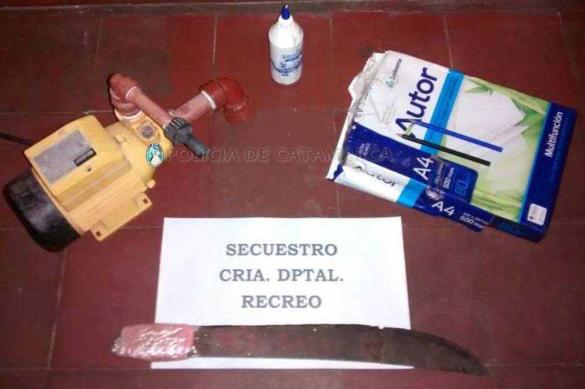 Al finalizar los registros se logró recuperar una bomba de agua, una resma de papel, un machete, y elementos de librería; los cuales habrían sido sustraídos ayer en horas de la mañana, de las Oficinas Públicas del Ministerio de Producción, ubicadas en la ruta nacional Nº 157.