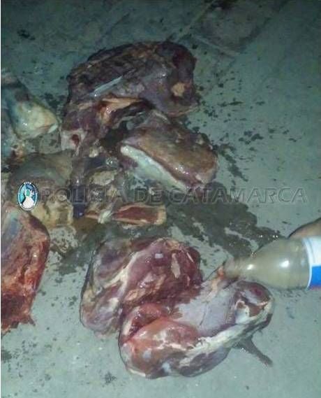 Allí se logró el secuestró de carne vacuna, la cual habría sido faenada en el lugar donde se observaron manchas de sangre, encontrándose además un cuchillo tipo carnicero, una sierra, las orejas del animal con su señal correspondiente como así también huesos y viseras que también fueron decomisados .