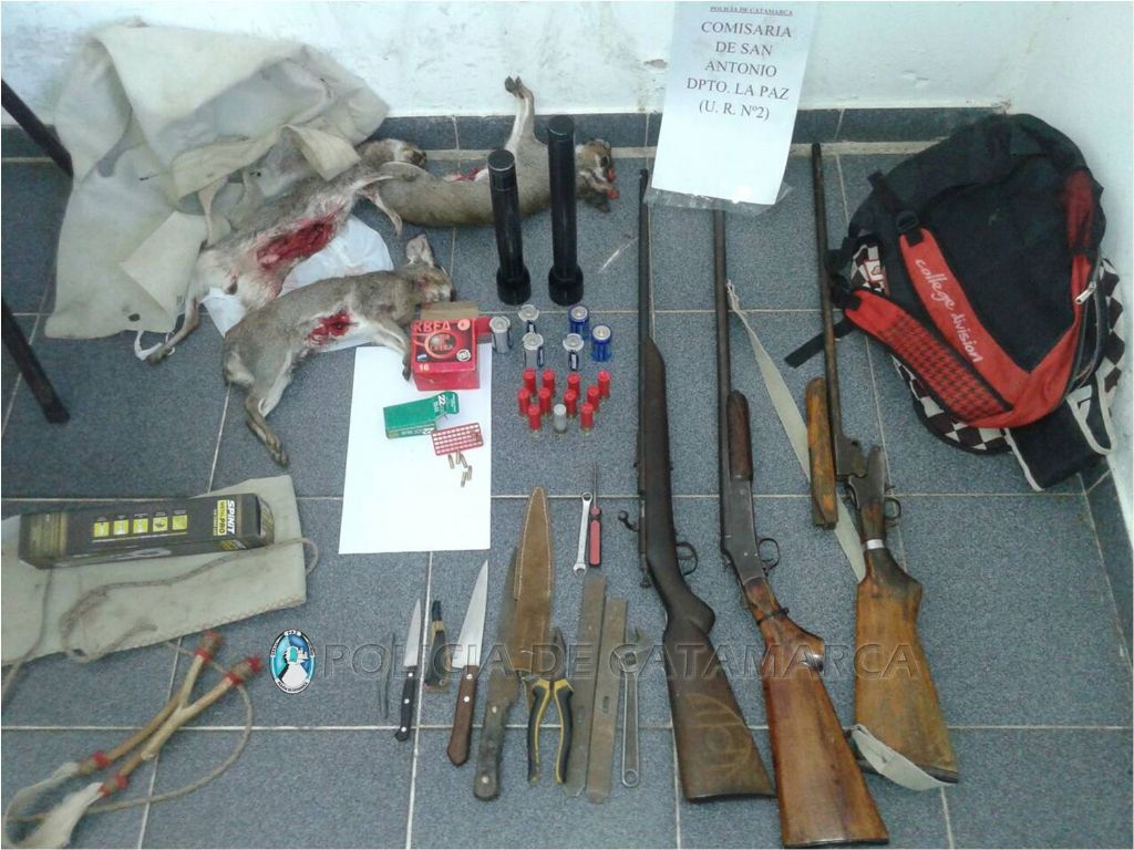 cartuchos 22mm; tres cuchillas; dos linternas, y tres liebre que habían sido