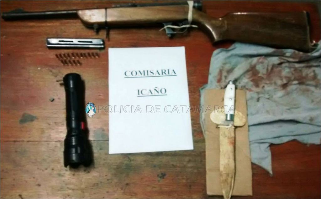 22, con su cargador y 16 cartuchos, un cuchillo tipo carnicero, y una linterna.