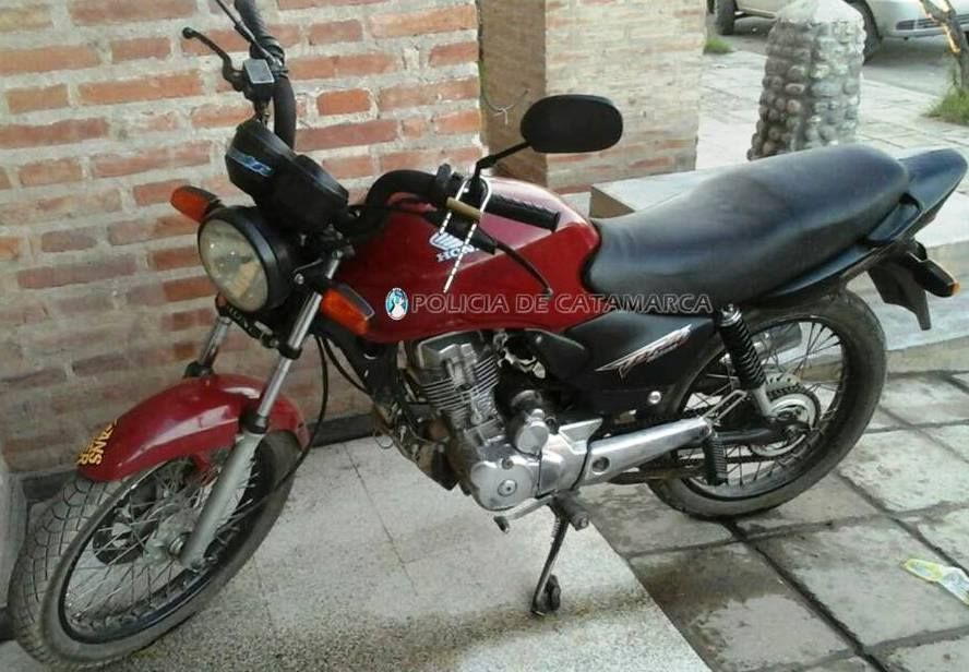 una motocicleta Honda CG Titan 125cc., dominio 128-CUR, de color bordo, sin la