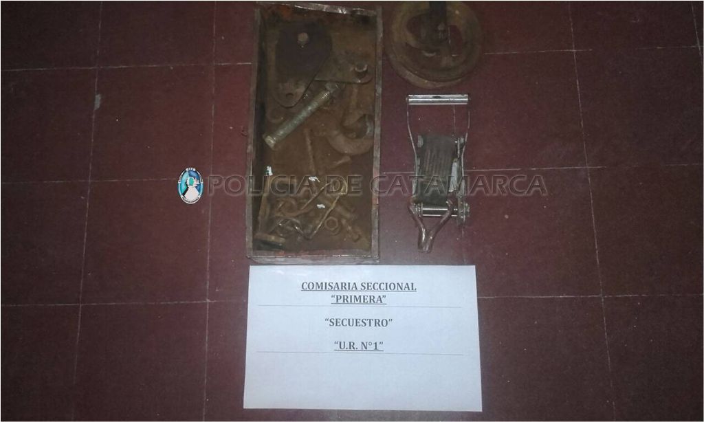 Los elementos secuestrados son: una caja de lata, dos poleas, dos ganchos, una cadena grande de 20 cm, 10 tornillos chicos, un cricquet, un tornillo grande y una base de hierro.