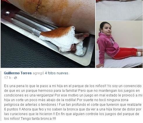 "Es una pena lo que le paso a mi hija en el parque de los niños!! Yo soy un convencido de que es un parque hermoso para la familia! Pero que no mantengan los juegos en condiciones es una vergüenza! Por ese motivo un juego en mal estado le provocó a mi hija un corte un poco más abajo de la rodilla! Por suerte no tocó ninguna zona peligrosa de arterias o tendones ! Fue tan profundo el corte que tuvieron que realizarle 6 puntos !! Ahora que feo y no saben la bronca que da ver a una hija llorar de dolor por las curaciones que le hicieron !! En fin que alguien controle los juegos del parque de los niños! Tengo tanta bronca !!!!"
