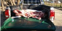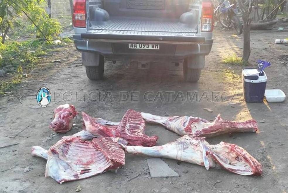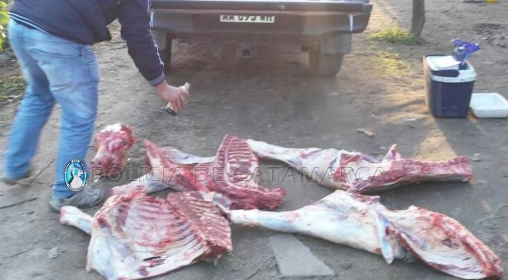 En el lugar, se procedió a controlar una camioneta Toyota Hilux, dominio AA095WH, color gris, cabina simple conducida por Raúl Marcelo Montivero de 44 años oriundo del departamento Paclín, quien trasladaba en la caja del rodado, y tapado con un nylon, un animal vacuno completo faenado de aproximadamente 80 kg.