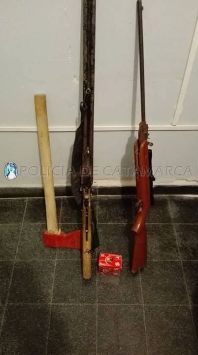 caño cal. 16, con 21 cartuchos, un rifle a aire comprimido, un hacha y