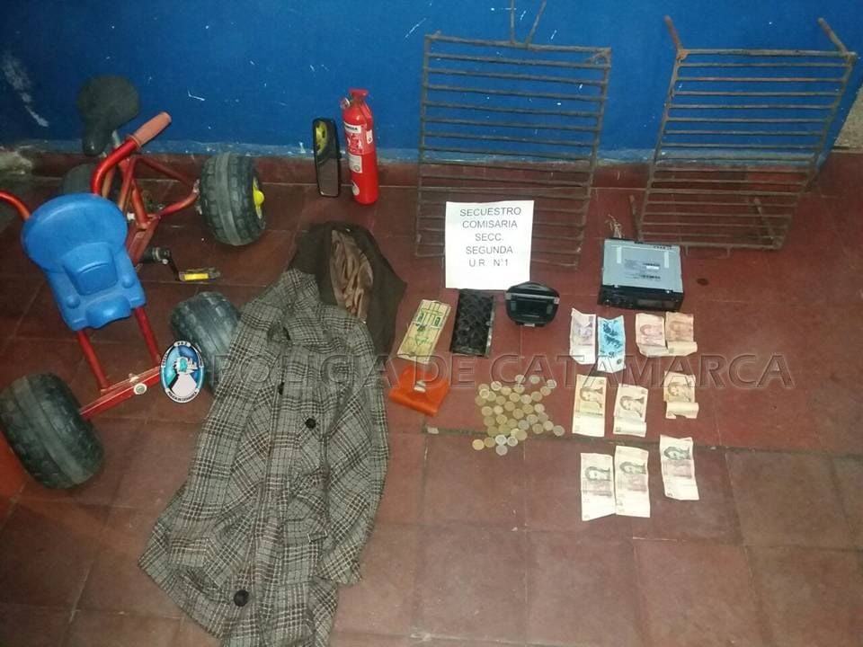 Más tarde, tras averiguaciones practicadas, los policías lograron secuestrar del domicilio del jovencito ubicado en la calle Clero Ahumada al 2.000,1 matafuegos chico, varias prendas de vestir, 2 parrillas de metal, 2 carteras de dama, 1 espejo retrovisor,1 cuatriciclo infantil y dinero en efectivo, que serían productos de un ilícito perpetrado en horas de la mañana en la calle Adolfo Castellano al 300.