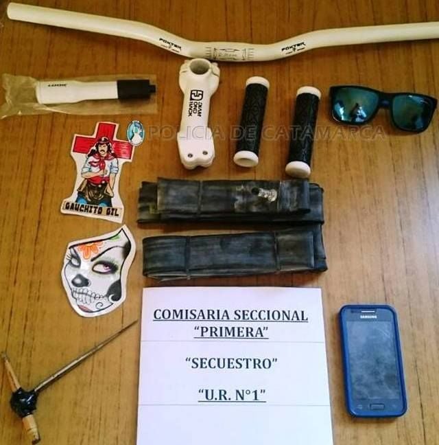 Al practicarle un cacheo superficial se le encontró entre sus prendas de vestir, un manubrio, un porta manubrio, dos cámara de bicicleta, un par de lentes para sol, dos calcos, un par de puños para bicicletas, un celular marca Samsung y un elemento punzante de fabricación casera denominado "espadita”.
