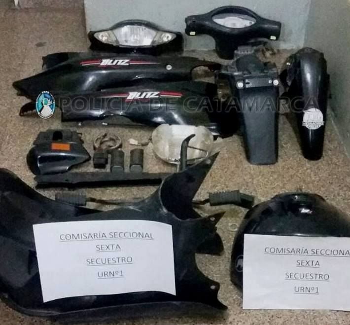 Hoy, a las 14:30, al tomar conocimiento que efectivos de la División Investigaciones habían recuperado una Motomel Blitz 110 cc., de color negro que fue robada en el B° 100 Viviendas Sur de esta Ciudad Capital, personal de la Comisaría Sexta llevó a cabo tareas investigativas y secuestró varias motopartes en un domicilio del Barrio Libertador II, propiedad de la familia Vega.