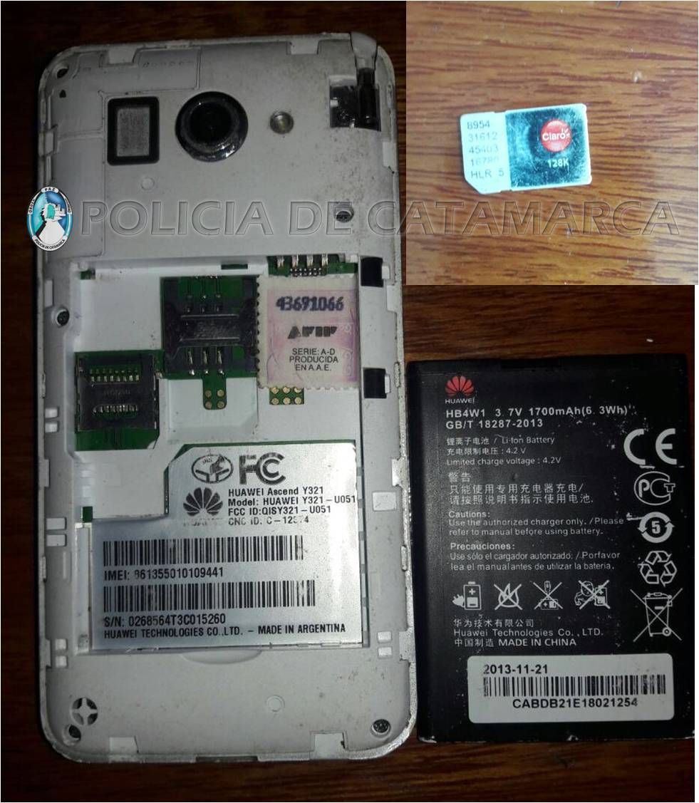 En un domicilio ubicado en el barrio Barrialito de la Localidad de Fiambalá, Departamento Tinogasta, propiedad de la familia Olmos, y en una vivienda ubicada en la 2º etapa del barrio Hipódromo de esta ciudad Capital, donde reside un hombre de apellido Olmos, los investigadores secuestraron un teléfono celular Huawei Y321, de color blanco, y una netbook Samsung de color negro.