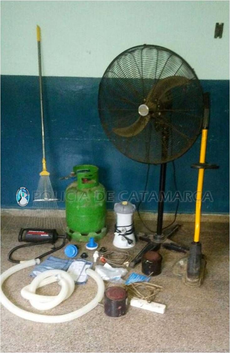 Según informó la policía, recuperaron un inflador, una garrafa de gas de 10 kg, un rastrillo, una manguera corrugada, dos estufas a combustible y dos prolongadores de corriente.