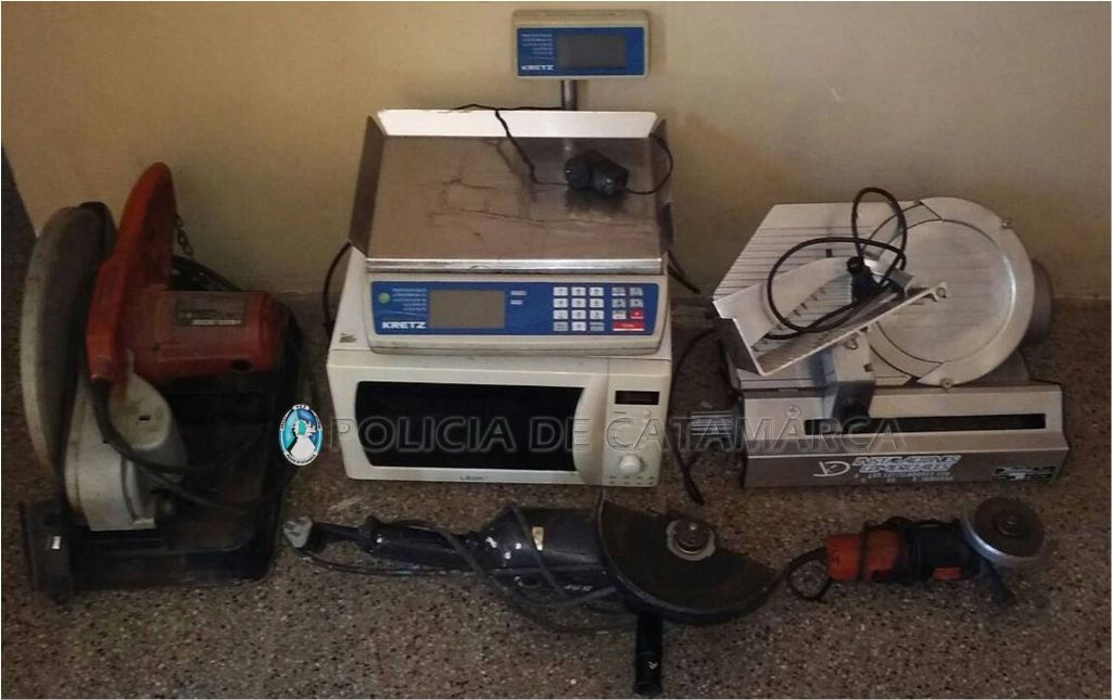 En una de las viviendas, el personal policial interviniente incautó una máquina sensitiva Black&Decker, de color anaranjado; una cortadora de fiambre Trinidad, de color gris; 1 balanza digital Kretz; 1 microondas marca Alcón, de color blanco; 1 amoladora Black&Decker y 1 amoladora industrial de color gris.