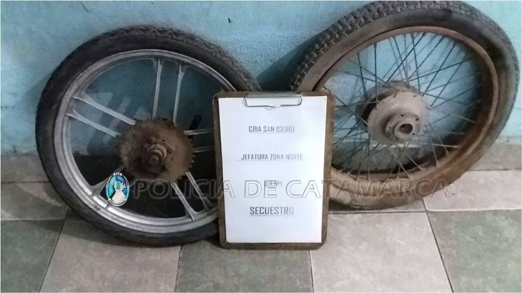 sustrajeron dos ruedas de una motocicleta Mondial 110 cc., de color azul, que