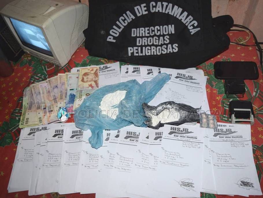 Allí incautaron 521 recetas médicas adulteradas con el membrete del Hospital Interzonal San Juan Bautista de esta Ciudad Capital, en las que se indicaban distintos ansiolíticos tales como Dalam, Clonazepan, Dormicum, Rivotril, entre otros; 2 sellos de médicos clínicos y psiquiatra, $1600 en efectivo, discriminados en billetes de distintas denominaciones; 1 teléfono celular Motorola de color negro; 300 gramos de Cocaína; 1 blíster con cinco pastillas de Clonazepan y un automóvil.
