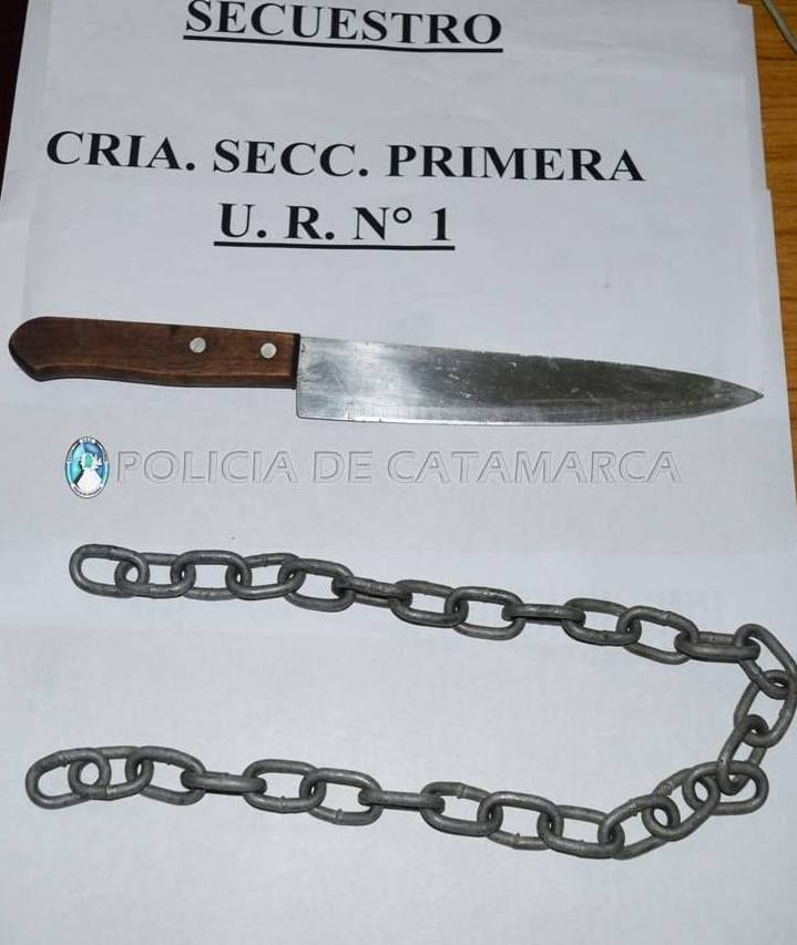 Hoy, a las 14:35, en la calle Tucumán al 200, efectivos de la Comisaría Primera aprehendieron a una mujer de apellido Nieva, de 38 años, quien habría intentado agredir físicamente a un hombre de 37 años, utilizando una cadena y una cuchilla que quedaron en calidad de secuestro.