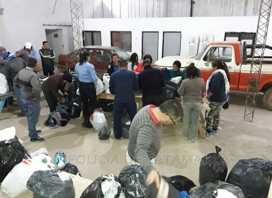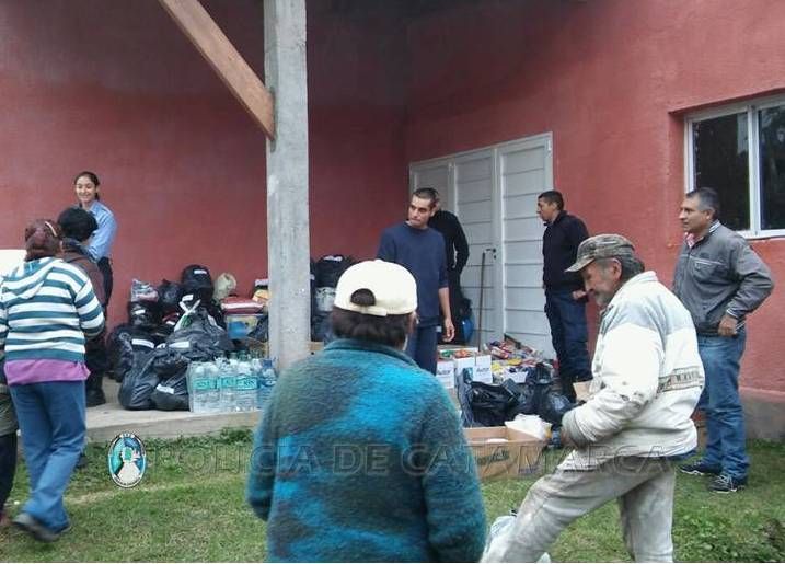 Durante la jornada del día jueves 13 del corriente mes y año, Directivos y Aspirantes a Agentes de la Escuela de Suboficiales y Agentes Fray Mamerto Esquiú de la Policía de la Provincia, conjuntamente con efectivos de la Comisaría Los Varela, luego de una campaña solidaria realizada días atrás con el fin de brindar ayuda a las familias damnificadas por las inclemencias climáticas registradas en la zona del Departamento Ambato, llegaron hasta las localidades de Las Chacritas y Singuil, donde entregaron alimentos no perecederos, ropa y calzado.
