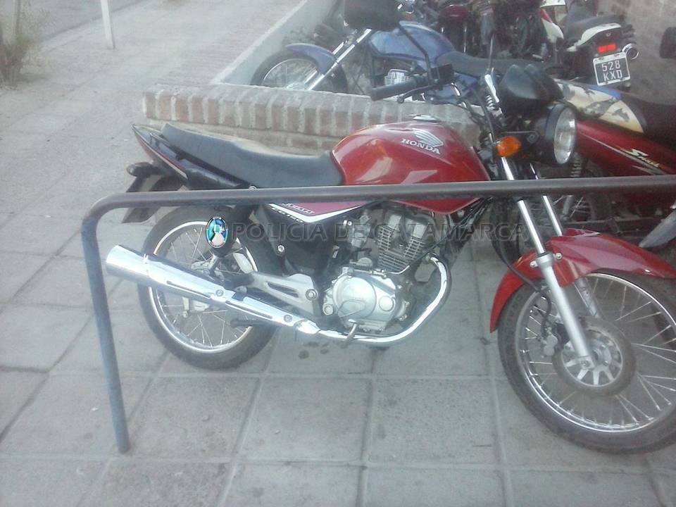 una motocicleta honda CG 150 cc., dominio 885-JXS, de color bordo, en sentido