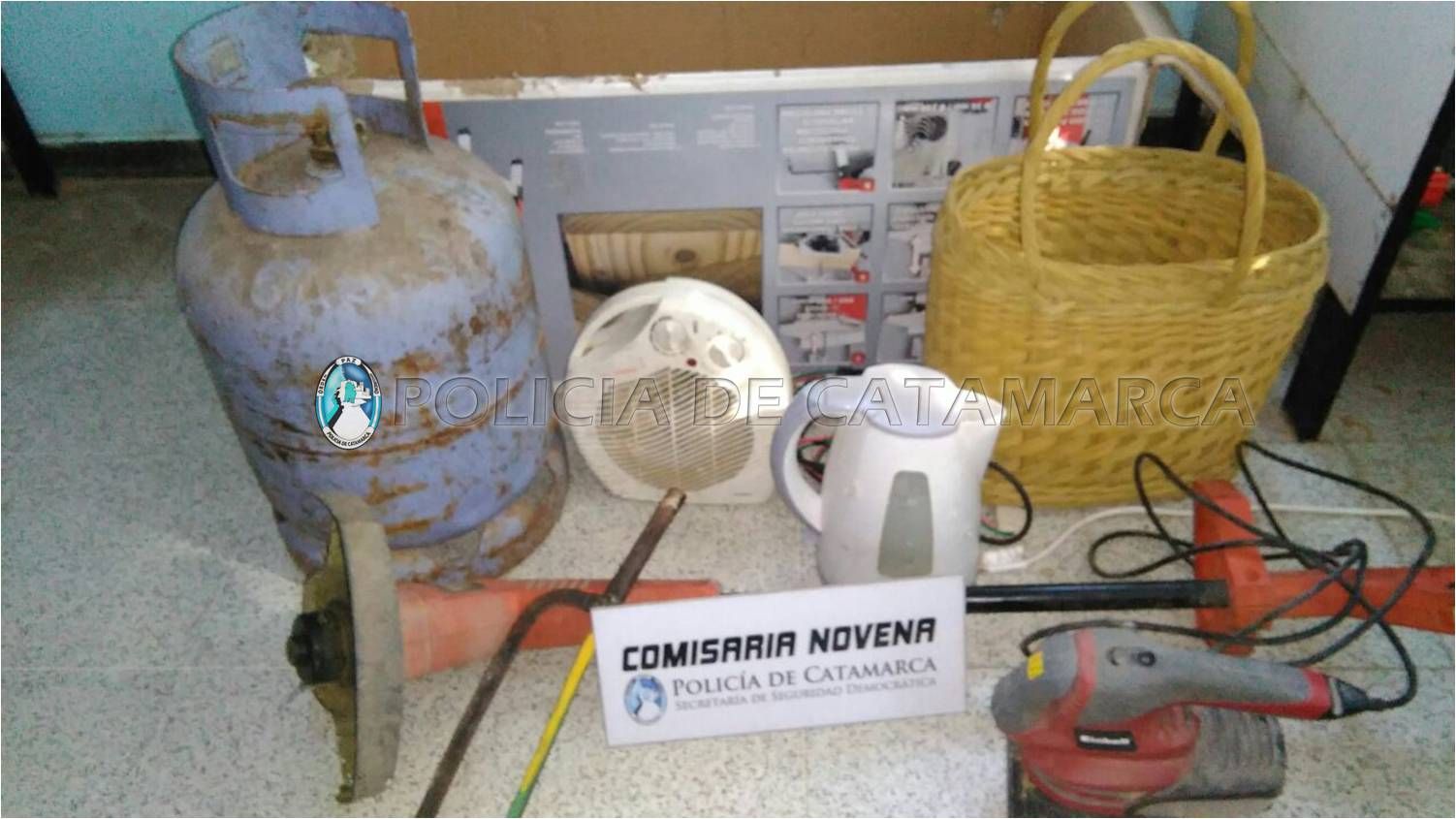 Habría robado 1 garrafa de gas de 10 Kg. de color celeste, 1 caloventor de color blanco, 1 pava eléctrica blanca, 1 bordeadora de césped de color rojo con negro, 1 sierra de mano, 1 canasta de mimbre de color marrón y 1 lijadora de colores rojo y gris, de los cuales no pudo acreditar la legítima propiedad y procedencia.