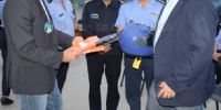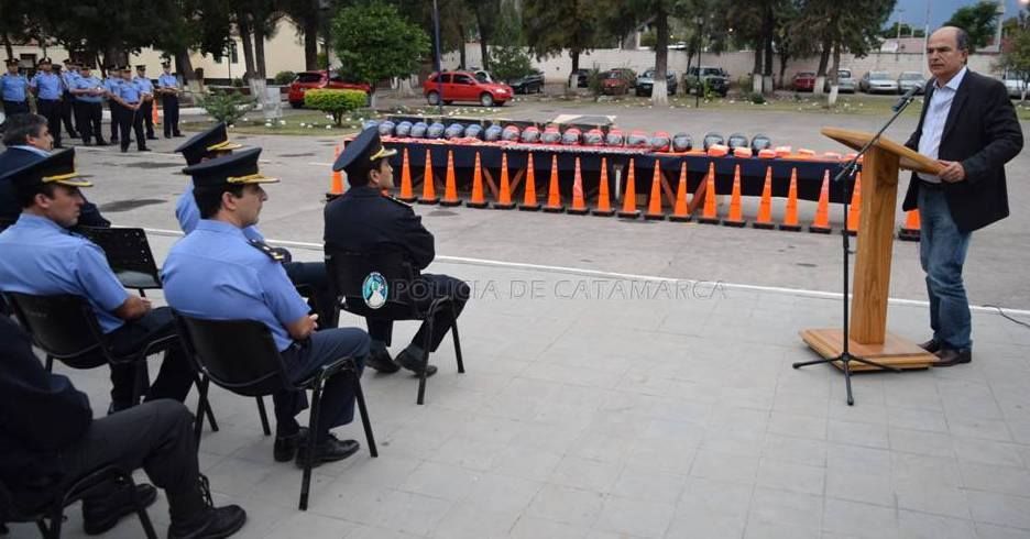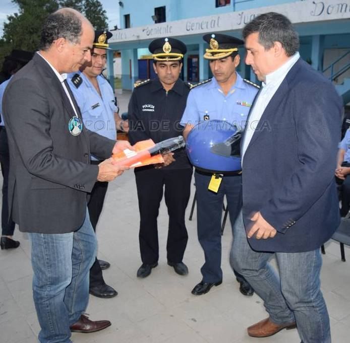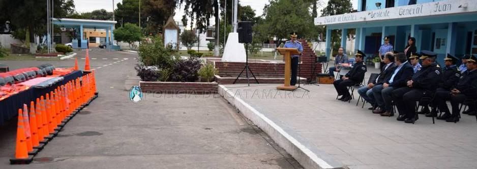 Finalmente, el Jefe de Policía junto al titular de la Unidad Regional Nº 1, recibieron los elementos de manos del Secretario de Estado de Seguridad y del Director de Seguridad Vial de la Provincia, y luego todos los presentes pasaron vista de los instrumentos de trabajo que fueron exhibidos en la Plaza de Armas de la casa de estudios policiales.
