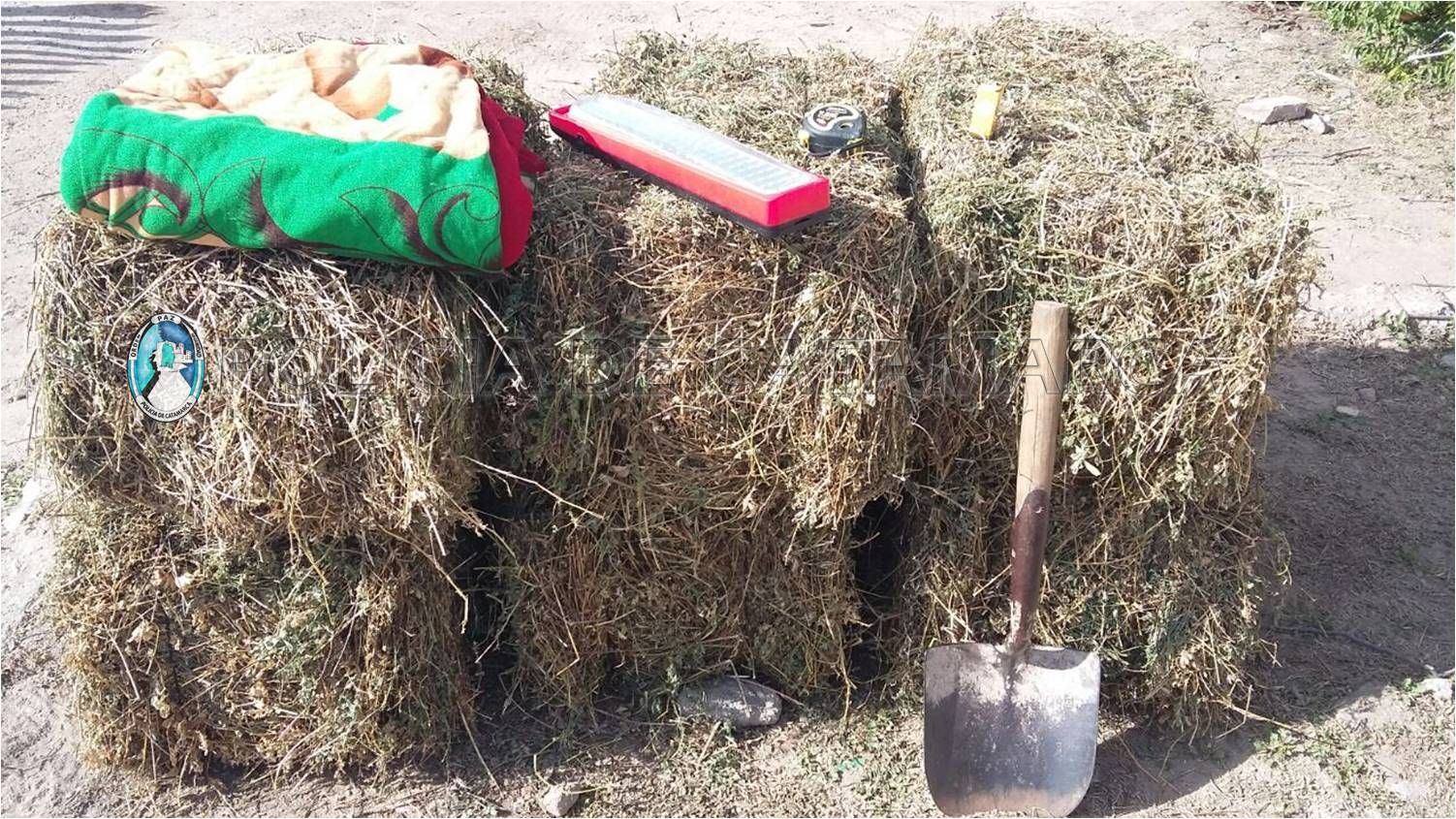 Allí encontraron 6 fardos de alfalfa, una pala tipo corazón, una luz de emergencia marca Tafint, una cinta métrica de 7 metros, un complejo vitamínico B12 y B15, y una frazada de colores rojo y verde.