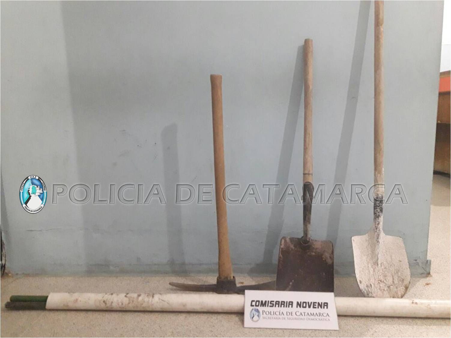 Hoy, a las 12:50, policías se constituyeron en un domicilio del sector “A” del B° Luis Franco, donde una mujer de 31 años manifestó que personas desconocidas le habrían vendido 1 picota, 2 palas anchas, y 4 caños.